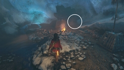 Avancer le long du corridor gelé jusqu'à la chute d'eau et repérer la paroi de glace friable. Sauter et utiliser les piolets pour s'accrocher à la paroi qui s'effondre sous le poids de Lara. Glisser le long du couloir et atterrir. Ne pas descendre le long du sentier : faire demi-tour, gravir le chemin et se hisser sur le rebord. Récupérer 1 document (1/4) (Russe EXP +15) (EXP +15). Noter la paroi de glace friable qui permet de remonter vers l'entrée de la grotte si nécessaire. Revenir vers le sentier en contrebas et passer sous l'arche. Lara note la température glaciale. À gauche, derrière la chute d'eau la plus éloignée, récupérer 1 relique (1/3) (EXP +25). Examiner la pointe de flèche pour découvrir son secret (Mongol EXP +15). Plonger dans l'eau et nager vers l'arche.