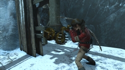 Actionner la manivelle grâce au piolet pour faire descendre le second contrepoids au maximum. Attention : le passage est minuté. Courir sur le troisième mât (sprinter si possible), tourner à droite et tout de suite s'élancer vers le contrepoids pour détruire le mur de glace.