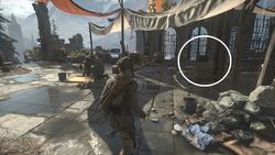 Commencer par grimper dans la maison la plus proche et ouvrir 1 caisse pour trouver des matériaux. Dans la maison, il y a des munitions pour fusil à pompe ainsi qu’1 carte de l’archiviste (3/4) posée sur une table. Descendre vers le lieu du combat, ouvrir 1 caisse avec des matériaux et 1 boîte avec des champignons, du tissu et du pétrole. Dans la deuxième maison, il y a 1 conteneur orange avec du tissu (EXP +25). Revenir vers le haut-village et entrer dans la grande maison sur la droite, là où l’on soigne les blessés. Récupérer 1 document (14/16) (Grec EXP +15) sur une commode (EXP +15).