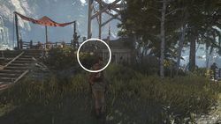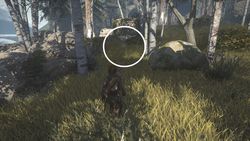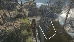 Descendre et aller vers l’arrière de la vallée, en direction de la rivière le long de la paroi rocheuse. Près des bouleaux, creuser pour trouver 1 cache de survie (6/11) avec des matériaux (EXP +25). Suivre le sentier vers le ponton cassé sur la gauche. Juste avant le ponton, trouver 1 cache de survie (7/11) avec des peaux (EXP +25).