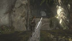 Poursuivre. Glisser le long de la tyrolienne, aller jusqu’au caveau et ouvrir le sarcophage pour récupérer 1 morceau d’arc ancien (3/4). Faire le chemin inverse pour ressortir. Depuis la chute d’eau, sauter dans la rivière en contrebas.