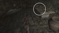 Monter les marches et suivre le couloir. Tourner à gauche, poursuivre et passer sous une arche. Il y a 1 pile de monnaie sur la droite. Aller tout droit et se glisser par la fissure sans la paroi. Avancer en rampant et entrer dans une zone inondée. Aller à droite vers les escaliers de pierre, passer derrière le puits et creuser pour trouver 1 cache de survie (3/11) avec du bois dur (EXP +25).