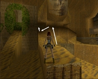 Tuer 4 panthères de plus. En bas, prendre une petite trousse et une grande trousse. Remonter et poursuivre. A la fin du couloir bleu, tuer 1 momie (très méchante !). Noter le petit tas de sable dans le coin de la pièce : lorsque Lara se place sur la partie la plus élevée du tas de sable, la momie n'attaque pas.