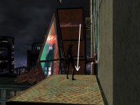 Prendre le couloir près du bar et appeler l'ascenseur. Monter sur les toits et repérer la moto dans l'entrepôt. Sortir sur la piste d'atterrissage. Repérer l'immeuble de Takamoto. Détruire la bonbonne dans le petit cagibi pour pouvoir grimper à la corniche. Sauter vers la plate-forme a droite puis se hisser sur le toit de l'entrepôt. Aller vers la verrière.